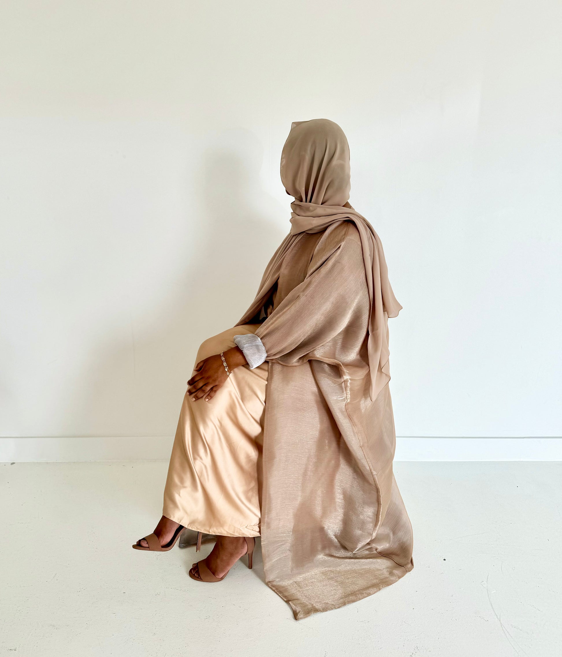 This stunning organza abaya has a fun twist - it's reversible, giving you two abayas in one! Its style is effortlessly elegant. This Amelia Abaya features a Bahrain-style design with convenient roll-up sleeves.