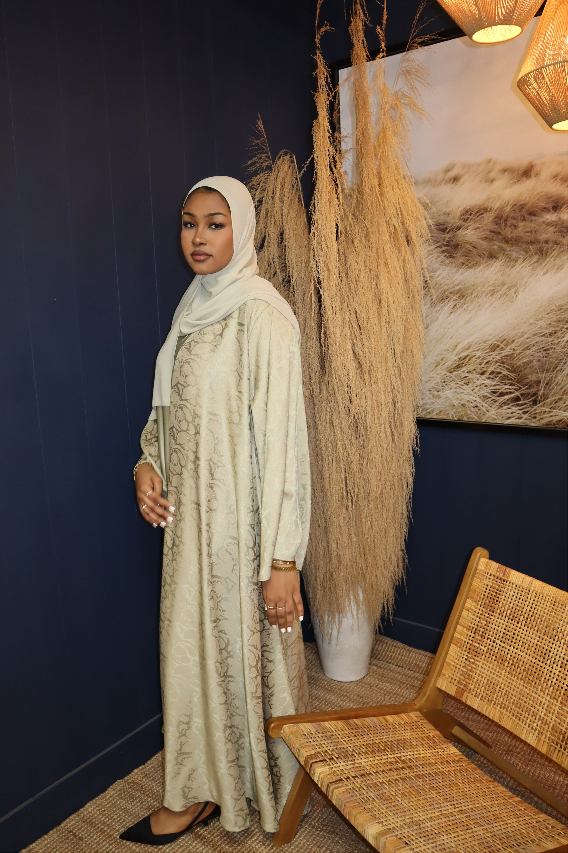 This abaya is crafted from a premium jacquard fabric, thoughtfully selected for its subtle woven texture and soft, luminous finish. Rendered in a calming sage tone, it reflects the essence of The Serene Collection—quiet elegance, modesty, and timeless design. The fluid drape creates a graceful silhouette, making it an effortless choice for Ramadan evenings, iftar gatherings, and refined nights out.